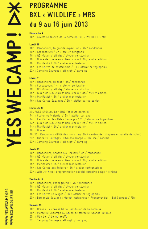 Marseille - 2013 - BXL WILDLIFE ON MARS : L'équipée sauvage du BRUXELLES WILDLIFE festival* (étendue) a été invitée à séjourner une semaine au YES WE CAMP : le fameux camping OVNI Marseillais ! Le YES WE CAMP nous ont confiés une carte blanche et les clefs du camping du 9 au 16 juin 2013. Nous avons décidé de partir en meute : histoire de tester et croiser nos démarches en milieu sur-extrême : pour une semaine d'ateliers quotidiens -dans et hors du camp- et une série d'événements de jour et de nuit. Le projet ce camping urbain déjanté et notre programmation détaillée par ici - sur ce BLOG et ici : BXL