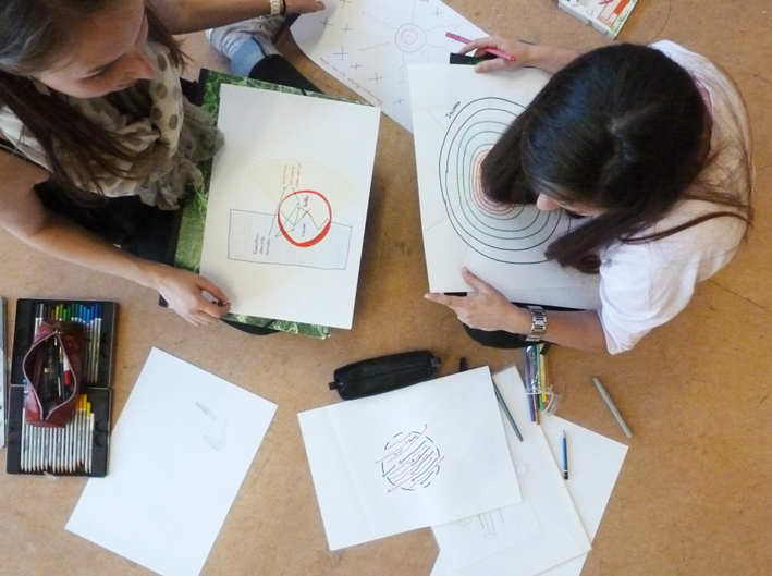 Sur une invitation d'Anne Stevens, architecte et responsable pédagogique du module de première année en architecture d'intérieur, il s'agissait de concevoir et mener 3 après-midi autour de la quotidienneté et d'expérimenter une approche performative autour de l'outil cartographique. Nous avons proposé un déroulé progressif partant de leurs travaux précédents, des exercices d'observation de l'espace, de déplacements et de positionnements dans l'atelier, et les uns par rapports aux autres. Un travail personnel puis en binôme, à partir d'exercices courts et réactifs de réciprocités (gestes du quotidien, récits de "nos géographies et systèmes quotidiens", feed-back cartographiés). L'idée étaient d'expérimenter pour soi et d'une façon de plus en plus ouverte et partagée, un outil ouvert et passer ainsi de la carte mentale personnelle aux cartes collectives!